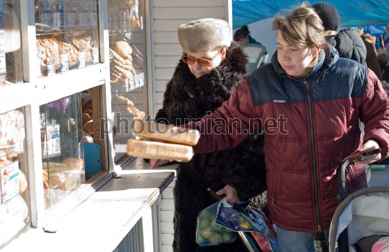 Жінка купує хліб у хлібному кіоску у Севастополі у четвер, 10 січня 2008 р. У Севастополі з 10 січня в середньому на 20% подорожчали хлібобулочні вироби. Як відзначив директор дочірнього підприємства «Цар-хліб» ТОВ «Хлібні інвестиції» Орест Андріяс, «подібне сьогодні не шокує, тому що всі розуміють, що ситуація доведена до того, що вся галузь, що виробляє продукт щоденного споживання, працює практично у збиток». З 1 грудня 2007 р. почалося підвищення вартості муки. За його словами, за період з 25 жовтня по 1 січня ціна на бензин виросла на 22%, муки - на 24%, на енергоносії - майже на 38%. Підприємство «Цар-хліб» підвищило ціни на хлібобулочні вироби від 12 до 21%. Фото Олексія Забусика / УНІАН