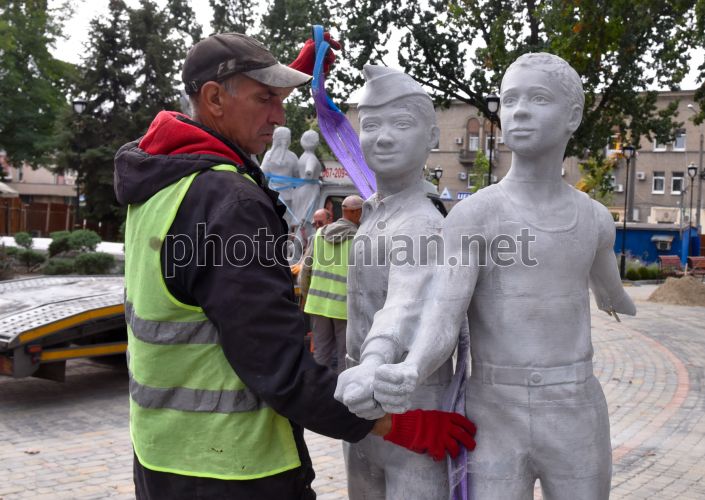 Встановлення скульптурної композиції на честь Дружби народів в сквері Піонерів в Олександрівському районі Запоріжжя, 29 вересня 2020 р. Реконструкція в сквері Піонерів, який був закладений ще в 1950-і роки, почалася в кінці 2019 року. Тут встановили скульптурну композицію на честь Дружби народів, яка замінила скульптуру з піонерами, встановлену в 50-і роки минулого століття. Скульптури створювали на 3D-принтері, відновлюючи їх за фотографіями.