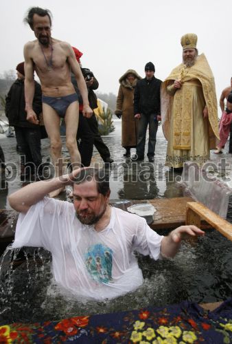 Чоловік купається в ополонці під час щорічного православного свята Хрещення Господня у Вишгороді (Київська обл.), в суботу, 19 січня 2008 р. Цього дня всі православні християни і греко-католики відзначають Хрещення Господнє. Віруючі згадують, як у віці 30 років Ісус з Галілєї дійшов річки Йордан, щоб прийняти хрещення водою від Іоанна Предтечі. Фото Євгена Орловського / УНІАН