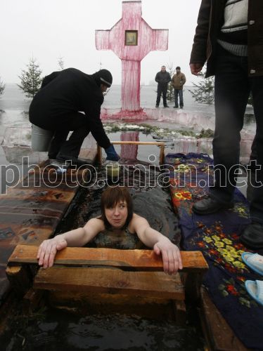 Жінка купається в ополонці під час щорічного православного свята Хрещення Господня у Вишгороді (Київська обл.), в суботу, 19 січня 2008 р. Цього дня всі православні християни і греко-католики відзначають Хрещення Господнє. Віруючі згадують, як у віці 30 років Ісус з Галілєї дійшов річки Йордан, щоб прийняти хрещення водою від Іоанна Предтечі. Фото Євгена Орловського / УНІАН