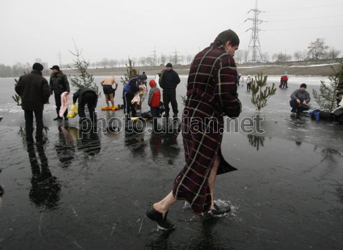 Чоловік йде по льоду після купання в ополонці під час щорічного православного свята Хрещення Господня у Вишгороді (Київська обл.), в суботу, 19 січня 2008 р. Цього дня всі православні християни і греко-католики відзначають Хрещення Господнє. Віруючі згадують, як у віці 30 років Ісус з Галілєї дійшов річки Йордан, щоб прийняти хрещення водою від Іоанна Предтечі. Фото Євгена Орловського / УНІАН