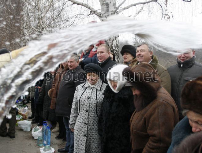Священнослужитель кропить святою водою прихожан під час щорічного православного свята Хрещення Господня у Вишгороді (Київська обл.), в суботу, 19 січня 2008 р. Цього дня всі православні християни і греко-католики відзначають Хрещення Господнє. Віруючі згадують, як у віці 30 років Ісус з Галілєї дійшов річки Йордан, щоб прийняти хрещення водою від Іоанна Предтечі. Фото Євгена Орловського / УНІАН