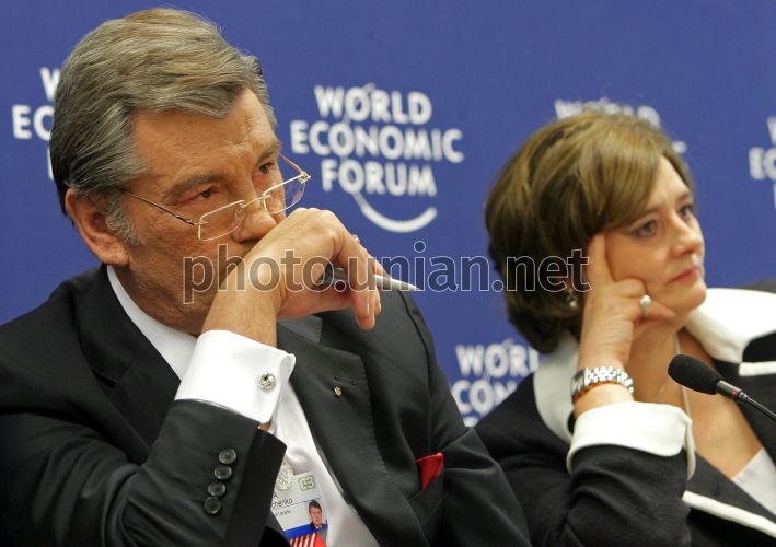 Президент України Віктор Ющенко та дружина колишнього прем'єр-міністра Велокобританії Тоні Блера, Чери, на сесії щорічного засідання Всесвітнього економічного форуму на тему “Права людини на всесвітньому порядку денному” в Давосі (Швейцарія) у четвер, 24 січня 2008 р. Фото Миколи Лазаренко / POOL / УНІАН