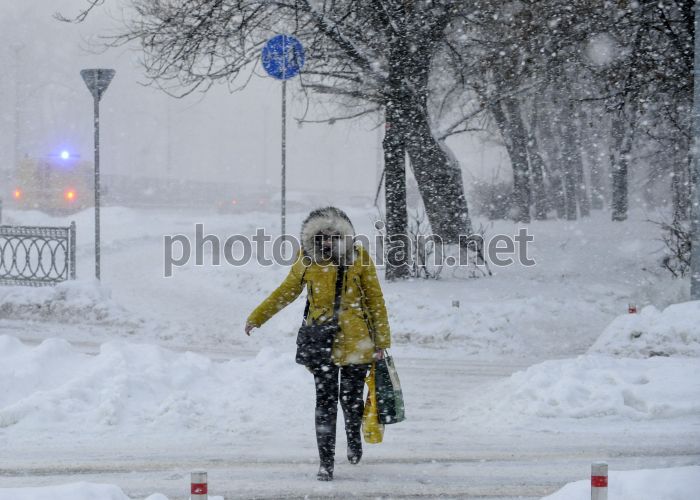 Дівчина під час снігопаду, в Києві, 12 лютого 2021 р. Фото Чузавков Сергій / УНІАН