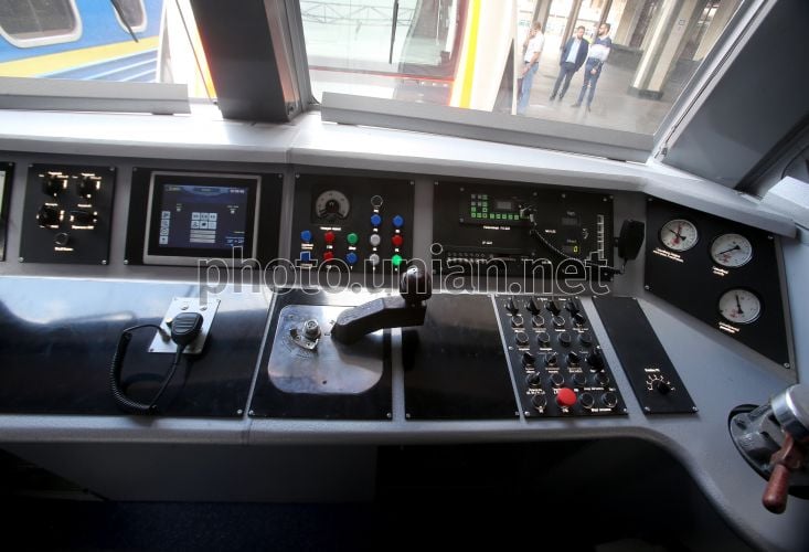 Кабіна машиніста в капітально відновленому електропоїзді серії ЕР9М (Київський електровагоноремонтний завод) під час представлення оновленого рухомого складу Укрзалізниці на платформі Центрального залізничного вокзалу Києва, 27 серпня 2021 р. Фото Синиця Олександр / УНІАН