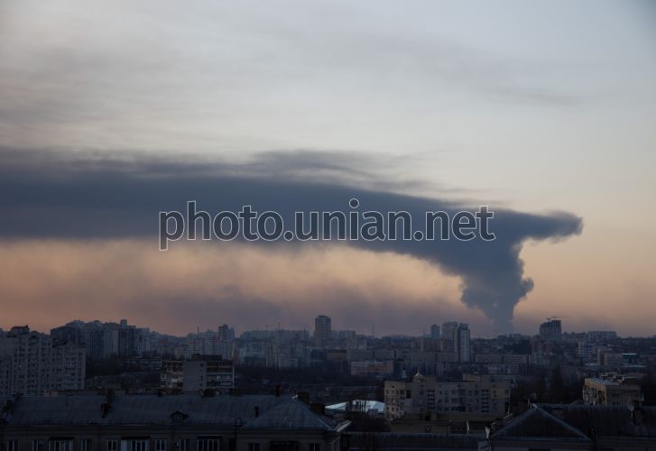 Дим від пожежі в результаті ворожого обстрілу в небі над Києвом, 25 березня 2022 р. Фото УНІАН