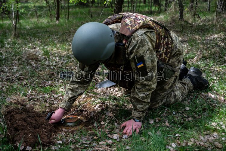 Сапери 115-ї окремої бригади територіальної оборони Житомирщини під час робіт з розмінування, 4 травнЯ 2022 р. Сапери 115-ї окремої бригади територіальної оборони Житомирщини показали, як виконують роботи з розмінування, та розповіли про заборонені міни, які використовує ворог. Фото Ратинський В'ячеслав / УНІАН