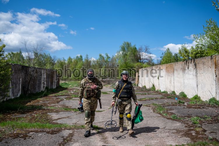 Сапери 115-ї окремої бригади територіальної оборони Житомирщини під час робіт з розмінування, 4 травнЯ 2022 р. Сапери 115-ї окремої бригади територіальної оборони Житомирщини показали, як виконують роботи з розмінування, та розповіли про заборонені міни, які використовує ворог. Фото Ратинський В'ячеслав / УНІАН