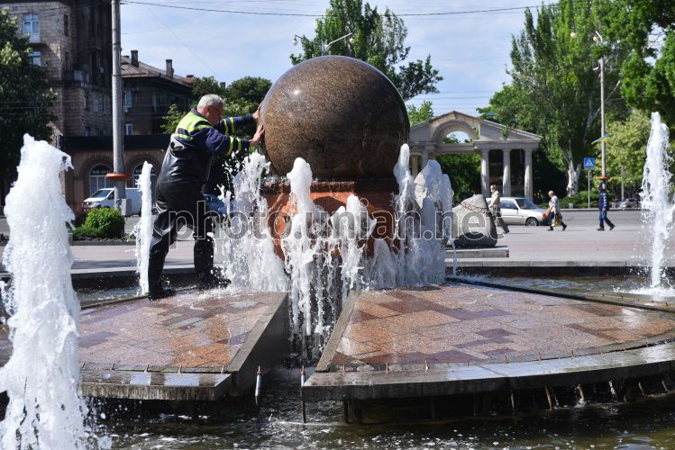 Фонтан життя у Запоріжжі, 24 травня 2022 р. Цього дня завершуються підготовчі роботи до запуску фонтану. 25 травня Фонтан життя запрацює у звичному режимі. Фонтан має кулю, що обертається під дією води. А скульптури, які знаходяться навколо фонтану, відображають історію українського народу. Фото Прилепа Олександр / УНІАН