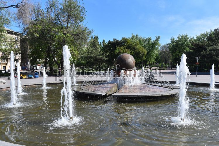 Фонтан життя у Запоріжжі, 24 травня 2022 р. Цього дня завершуються підготовчі роботи до запуску фонтану. 25 травня Фонтан життя запрацює у звичному режимі. Фонтан має кулю, що обертається під дією води. А скульптури, які знаходяться навколо фонтану, відображають історію українського народу. Фото Прилепа Олександр / УНІАН
