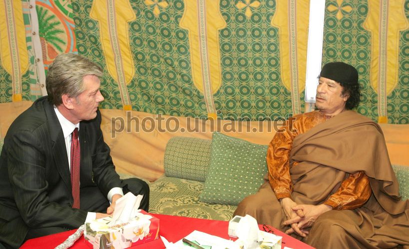 Президент України Віктор Ющенко, ліворуч, та лідер лівійської революції Муамар Каддафі під час зустрічі в м. Триполі, Велика Соціалістична Народна Лівійська Арабська Джамагирія, в понеділок, 7 квітня 2008 р. Фото Миколи Лазаренка / POOL / УНІАН