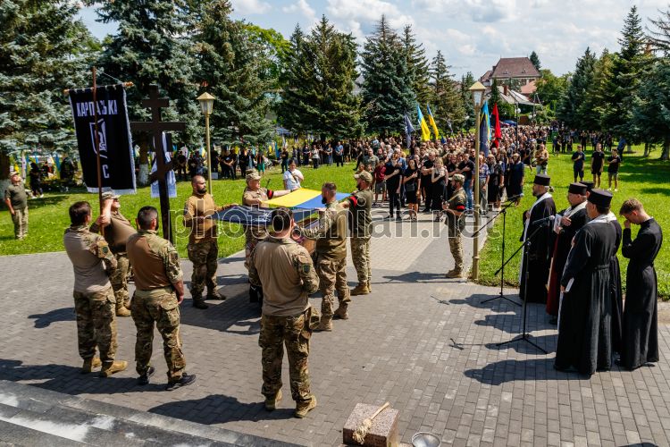 Церемонія прощання із загиблим військовослужбовцем, заступником командира групи спецпризначення військової частини А 6175 Анатолієм Тегзою в Ужгороді, 22 липня 2023 р. Врятувавши побратима та командира суміжного підрозділу, Анатолій Тегза загинув під час штурму ворожих позицій 14 липня 2023 року. Фото Немеш Янош / УНІАН