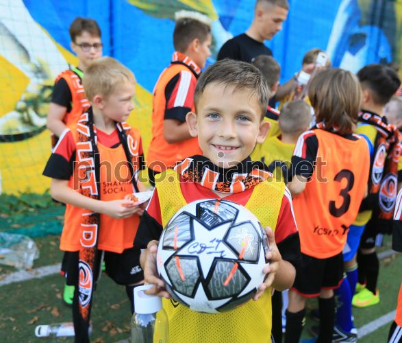 Юний футболіст під час візиту гравця національної збірної з футболу і донецького «Шахтаря» Данила Сікана на тренування у Львові, 13 вересня 2023 р. Фото Кравс Євгеній / УНІАН