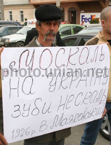 Один з учасників пікету генкосульства Російської Федерації, організованого представниками кримської організації Конгресу українських націоналістів та активістами Української народної партії, які протестували проти “посягань Росії на національну цілісність України” і вимагали негайно вивести з Севастополя і Криму російський Чорноморський флот в Сімферополі, у вівторок, 15 квітня 2008 р. Учасники пікету висловили своє обурення “заявами російської влади, які містять погрози територіальній цілісності України. Чорноморський флот повинен негайно піти з Криму”. Оскільки дозволу на свою акцію українські націоналісти не одержали, пікет проходив проти протизаконної діяльності “проросійської влади Криму”. Фото Олексія Сувірова / УНІАН