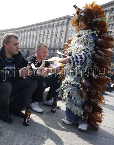 Учасник дитячого союзу ”Екологічна варта” в костюмі їжачка, зробленому з поліетиленових пляшок, роздає агітаційні листівки під час акції-гри ”Екологічні пазли”, приуроченої до міжнародного Дня Землі й Всеукраїнського дня навколишнього середовища, на Майдані Незалежності у Києві в суботу, 19 квітня 2008 р. День Землі відзначають 20 квітня. Діти зі всіх куточків України склали символічну картину із зображенням планети Земля і закликом ”Прибери планету”, що складається з 600 пазлів. Картина зайняла площу 36 квадратних метрів. Фото УНІАН