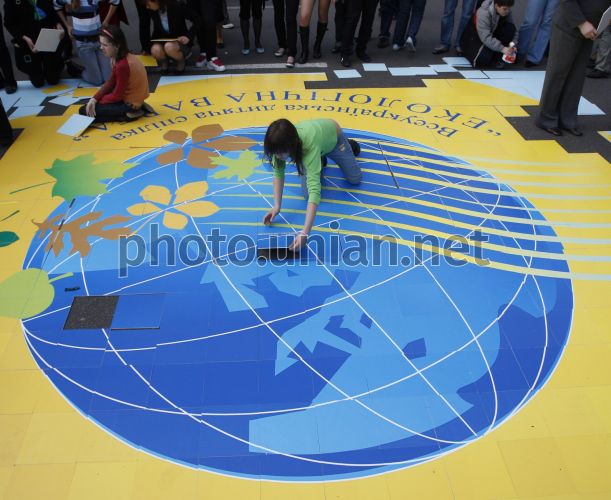 Учасники дитячого союзу ”Екологічна варта” під час акції-гри ”Екологічні пазли”, приуроченої до міжнародного Дня Землі й Всеукраїнського дня навколишнього середовища, на Майдані Незалежності у Києві в суботу, 19 квітня 2008 р. День Землі відзначають 20 квітня. Діти зі всіх куточків України склали символічну картину із зображенням планети Земля і закликом ”Прибери планету”, що складається з 600 пазлів. Дітям допомагали кияни і гості столиці. Картина зайняла площу 36 квадратних метрів. Фото УНІАН