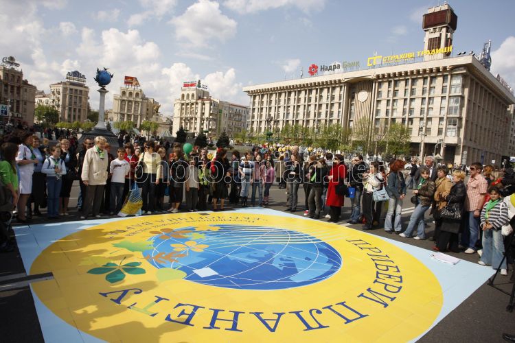 Учасники дитячого союзу ”Екологічна варта” під час акції-гри ”Екологічні пазли”, приуроченої до міжнародного Дня Землі й Всеукраїнського дня навколишнього середовища, на Майдані Незалежності у Києві в суботу, 19 квітня 2008 р. День Землі відзначають 20 квітня. Діти зі всіх куточків України склали символічну картину із зображенням планети Земля і закликом ”Прибери планету”, що складається з 600 пазлів. Дітям допомагали кияни і гості столиці. Картина зайняла площу 36 квадратних метрів. Фото УНІАН