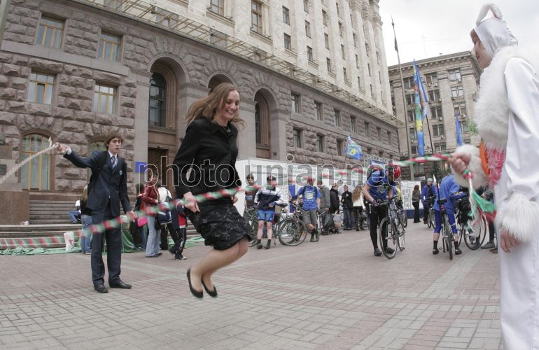 Члени Всеукраїнської громадської організації «Жива планета» проводять конкурси біля будівлі КМДА під час святкування міжнародного Дня Землі, у Києві в неділю, 20 квітня 2008 р. Захід проводився за підтримки Управління охорони навколишнього природного середовища (КМДА) з метою привернути увагу жителів Києва і гостей столиці до проблем сучасного стану навколишнього середовища. Фото Олени Старостенко / УНІАН