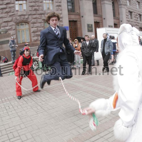 Члени Всеукраїнської громадської організації «Жива планета» проводять конкурси біля будівлі КМДА під час святкування міжнародного Дня Землі, у Києві в неділю, 20 квітня 2008 р. Захід проводився за підтримки Управління охорони навколишнього природного середовища (КМДА) з метою привернути увагу жителів Києва і гостей столиці до проблем сучасного стану навколишнього середовища. Фото Олени Старостенко / УНІАН