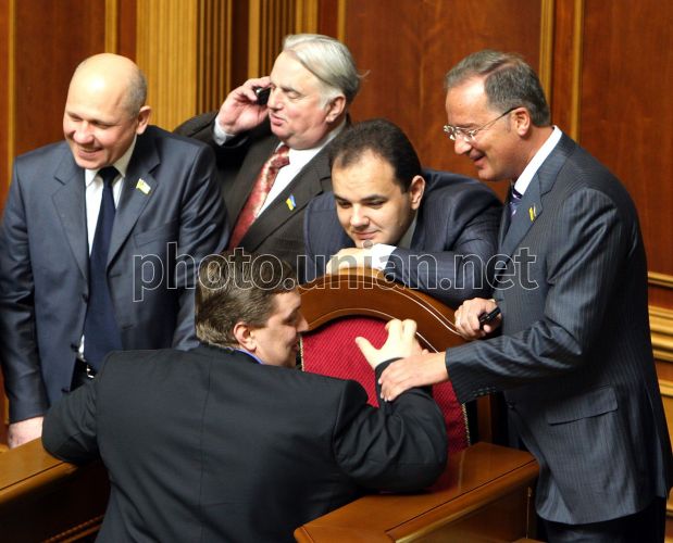 Народні депутати від фракції БЮТ блокують президіум у Верховній Раді, у вівторок, 13 травня 2008 р. В цей день о 10:00 Президент України Віктор Ющенко повинен був виступити у Верховній Раді з щорічним посланням про внутрішнє і зовнішнє становище України. Фракція БЮТ вимагає першочергового ухвалення низкии законодавчих актів, серед яких безмитне ввезення м’яса до України і встановлення цінових обмежень на групу продовольчих товарів. Фото Олександра Косарева / POOL / УНІАН
