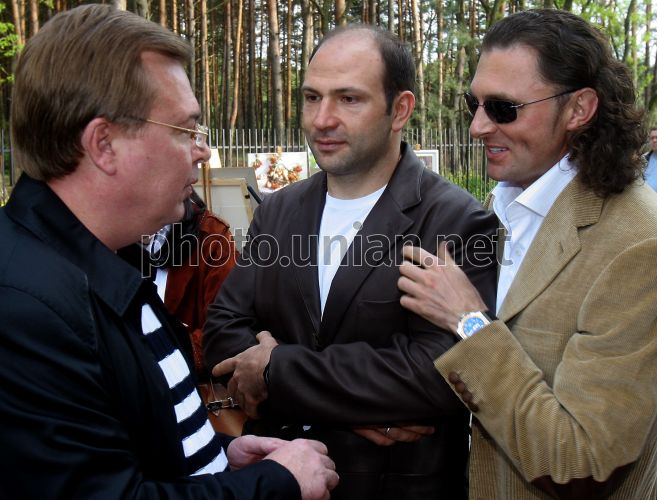 Зліва направо: голова Державної податкової адміністрації України Сергій Буряк, голова ради директорів Української будівельної асоціації Лев Парцхаладзе та власник закритого заміського клубу верхової їзди ”Стайня Бутенко” Олексій Бутенко розмовляють перед початком змагань з конкуру, в Києві у суботу, 17 травня 2008 р. Конкур – наймасовіший і популярніший вид кінного спорту. У цьому виді вершник з конем повинен пройти маршрут на конкурному полі, долаючи встановлені на ньому перешкоди у певній послідовності. При зачіпанні перешкоди легко руйнуються, значно зменшуючи вірогідність травми і падіння вершника та коня. Вперше конкури почали проводити у Бельгії з середини XIX століття. Змагання з подолання перешкод, виїздці і триборства були вперше включені до програми Олімпійських ігор у 1912 р. Фото Олександра Синиці / УНІАН