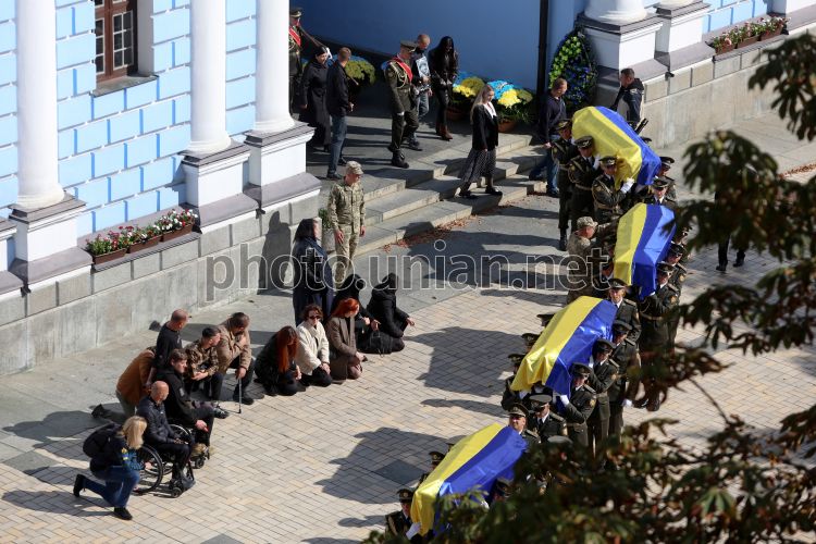 Церемонія прощання з загиблим захисником України Тарасом Шпуком та його побратимами Микитою Охріменком, Віктором Коцюбинським, Олегом Вишняковим та Романом Веркальцем в Києві, 25 вересня 2025 р. На фронті під час виконання бойового завдання загинув колишній співробітник фонду "Повернись живим", один із засновників ветеранського спорту в Україні та військовослужбовець Тарас Шпук. Йому було 34 роки. Фото Ковальчук Віктор / УНІАН