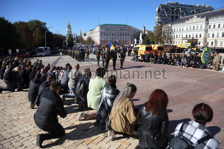Церемонія прощання з загиблим захисником України Тарасом Шпуком та його побратимами Микитою Охріменком, Віктором Коцюбинським, Олегом Вишняковим та Романом Веркальцем в Києві, 25 вересня 2025 р. На фронті під час виконання бойового завдання загинув колишній співробітник фонду "Повернись живим", один із засновників ветеранського спорту в Україні та військовослужбовець Тарас Шпук. Йому було 34 роки. Фото Ковальчук Віктор / УНІАН