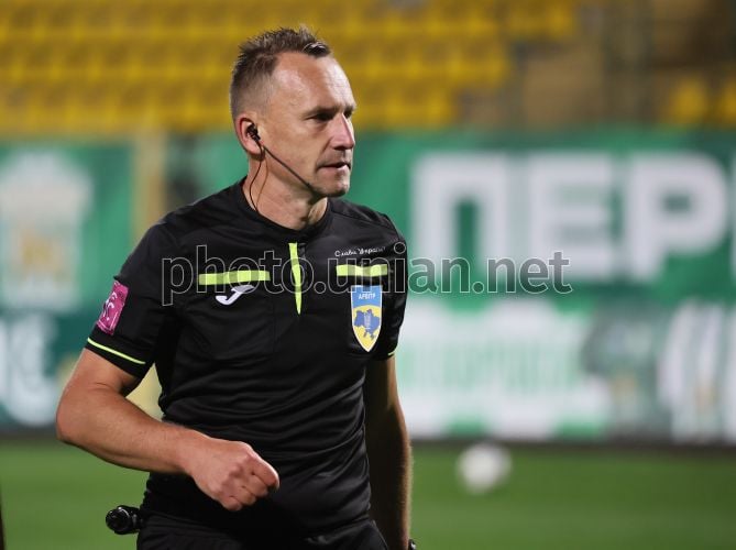 Головний арбітр Віталій Романов під час матчу 7-го туру Чемпіонату України з футболу серед команд УПЛ (Прем'єр-Ліга) сезону 2025/2026 між ФК “Карпати” (Львів) та ФК “Динамо” (Київ) на стадіоні "Україна" у Львові, 27 вересня 2025 р. Фото Кравс Євгеній / УНІАН