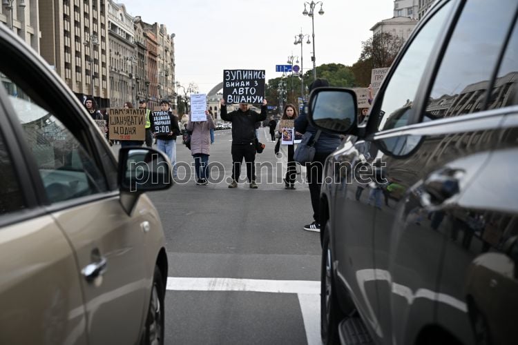 На проїжджу частину з плакатами в руках вийшли активісти, зупинився транспорт під час загальнонаціональної хвилини мовчання за загиблими внаслідок збройної агресії рф проти України, в центрі Києва, 1 жовтня 2025 р. У центрі Києва щодня зупиняють рух для загальнонаціональної хвилини мовчання. Захід присвячений пам’яті всіх загиблих у війні, яку росія розв’язала проти України. Фото Ратинський В'ячеслав / УНІАН