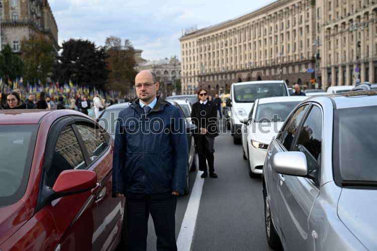 Водії вийшли з авто, щоб вшанувати пам’ять загиблих захисників та мирних жителів, під час загальнонаціональної хвилини мовчання за загиблими внаслідок збройної агресії рф проти України, в центрі Києва, 1 жовтня 2025 р. У центрі Києва щодня зупиняють рух для загальнонаціональної хвилини мовчання. Захід присвячений пам’яті всіх загиблих у війні, яку росія розв’язала проти України. Фото Ратинський В'ячеслав / УНІАН
