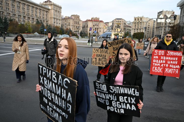 На проїжджу частину з плакатами в руках вийшли активісти під час загальнонаціональної хвилини мовчання за загиблими внаслідок збройної агресії рф проти України, в центрі Києва, 1 жовтня 2025 р. У центрі Києва щодня зупиняють рух для загальнонаціональної хвилини мовчання. Захід присвячений пам’яті всіх загиблих у війні, яку росія розв’язала проти України. Фото Ратинський В'ячеслав / УНІАН