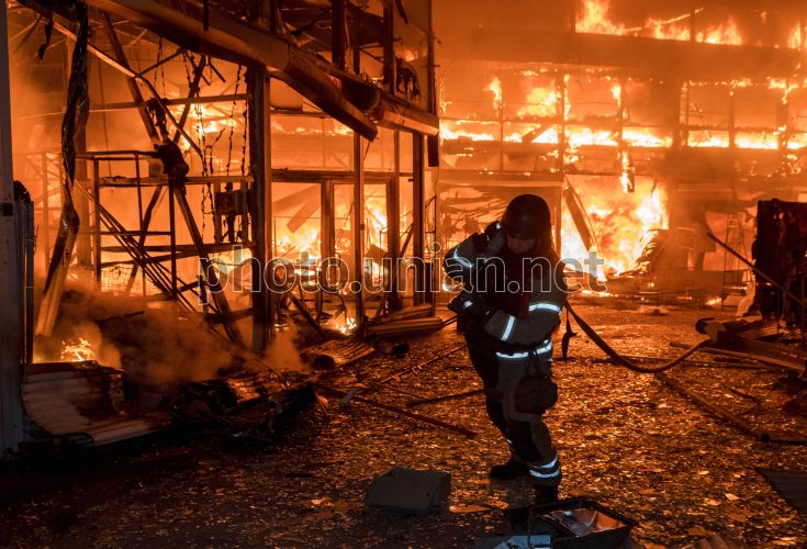 Рятувальники ліквідують пожежу, яка виникла внаслідок масованої атаки на Харків, 1 жовтня 2025 р. У ніч на 1 жовтня російські окупаційні війська влаштували комбіновану атаку на Харків. Ворог завдав масованих ударів керованими авіабомбами та ракетами. Влучання зафіксовані по території ринку, приватному житловому сектору, гаражному кооперативу та іншим об'єктам. Фото Марієнко Андрій / УНІАН