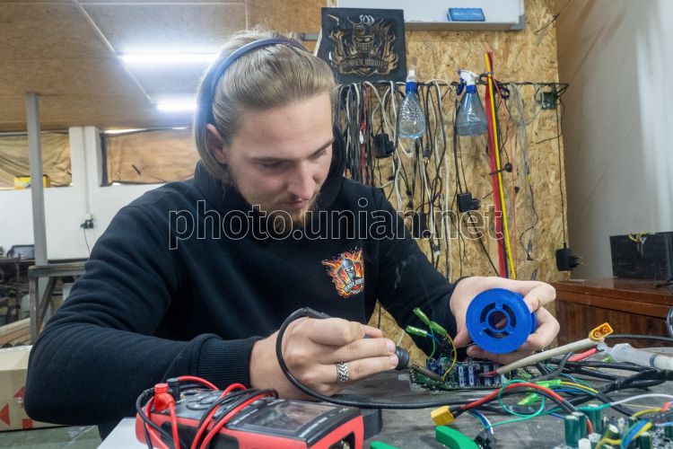 Співробітники підприємства BENDER ROBOTS збирають та випробовують наземні роботизовані комплекси власного виробництва, в Харкові, 3 жовтня 2025 р. Наземні роботизовані комплекси (НРК) — це сучасні роботизовані системи, які виконують небезпечні, незручні або неможливі для людини завдання на полі бою, як-от: розвідка, доставка боєкомплекту, вивезення поранених та виконання ударних місій. Фото Марієнко Андрій / УНІАН