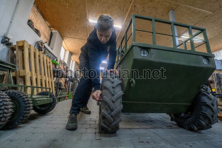 Співробітники підприємства BENDER ROBOTS збирають та випробовують наземні роботизовані комплекси власного виробництва, в Харкові, 3 жовтня 2025 р. Наземні роботизовані комплекси (НРК) — це сучасні роботизовані системи, які виконують небезпечні, незручні або неможливі для людини завдання на полі бою, як-от: розвідка, доставка боєкомплекту, вивезення поранених та виконання ударних місій. Фото Марієнко Андрій / УНІАН