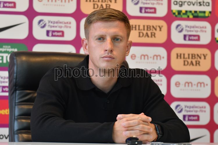 Головний тренер ФК "Олександрія" (Олександрія) Кирило Нестеренко під час пресконференції після матчу 8-го туру Чемпіонату України з футболу між ФК "Олександрія" (Олександрія) та ФК "Карпати" (Львів), в Олександрії (Кіровоградська область), 4 жовтня 2025 р. Матч закінчився з рахцнком 0:2 на користь ФК "Карпати". Фото Тис Микола / УНІАН