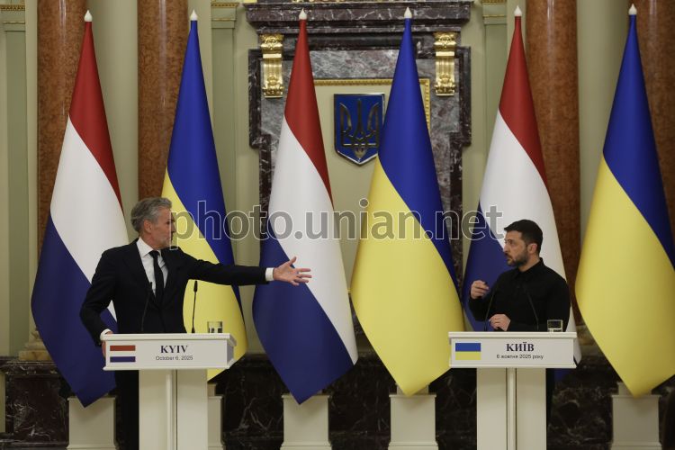 Президент України Володимир Зеленський і Прем’єр-міністр Нідерландів Дік Схооф під час спільної зустрічі з представниками медіа в Києві, 6 жовтня 2025 р. Прем’єр-міністр Королівства Нідерланди Дік Схооф перебуває з візитом в Україні. Фото Ковальчук Віктор / УНІАН
