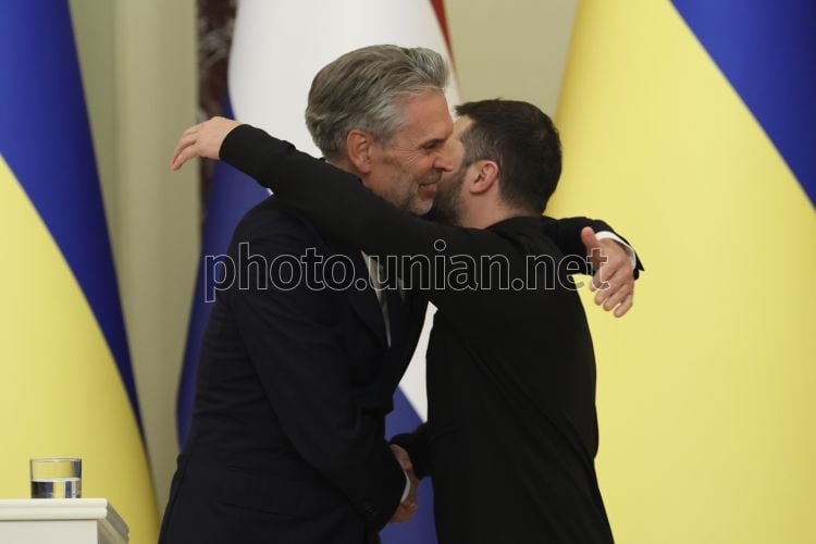 Президент України Володимир Зеленський і Прем’єр-міністр Нідерландів Дік Схооф під час спільної зустрічі з представниками медіа в Києві, 6 жовтня 2025 р. Прем’єр-міністр Королівства Нідерланди Дік Схооф перебуває з візитом в Україні. Фото Ковальчук Віктор / УНІАН