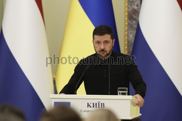 Президент України Володимир Зеленський під час спільної з Прем'єр-міністром Нідерландів Діком Схоофом зустрічі з представниками медіа в Києві, 6 жовтня 2025 р. Прем’єр-міністр Королівства Нідерланди Дік Схооф перебуває з візитом в Україні. Фото Ковальчук Віктор / УНІАН