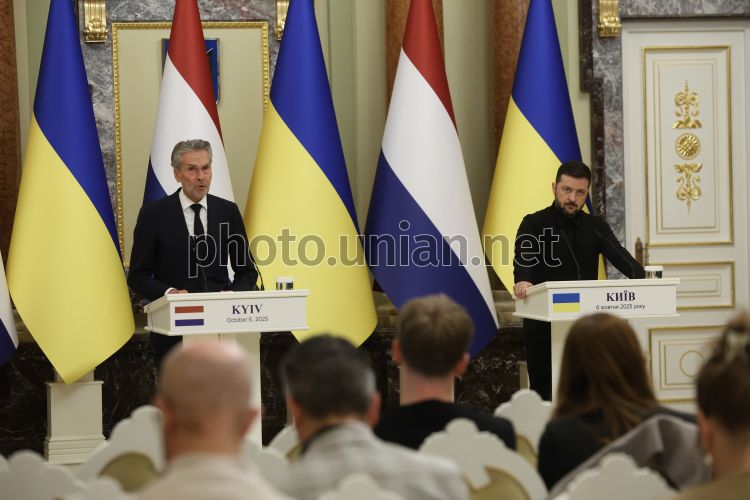 Президент України Володимир Зеленський і Прем’єр-міністр Нідерландів Дік Схооф під час спільної зустрічі з представниками медіа в Києві, 6 жовтня 2025 р. Прем’єр-міністр Королівства Нідерланди Дік Схооф перебуває з візитом в Україні. Фото Ковальчук Віктор / УНІАН
