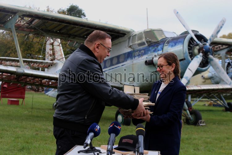 Президент громадської організації "Асоціація розвитку авіації України", президент акціонерного товариства "АС аеродром "Бородянка" Олександр Бадрудінов передає всю документацію літака АН-6 директорці Державного музею авіації України Валерії Лавренко під час пресконференції з нагоди передачі Державному музею авіації України літака-рекордсмена АН-6 і пасажирського АН-2 на постійне зберігання, у Державному музеї авіації ім. О.К. Антонова, в Києві, 7 жовтня 2025 р. Фото Синиця Олександр / УНІАН