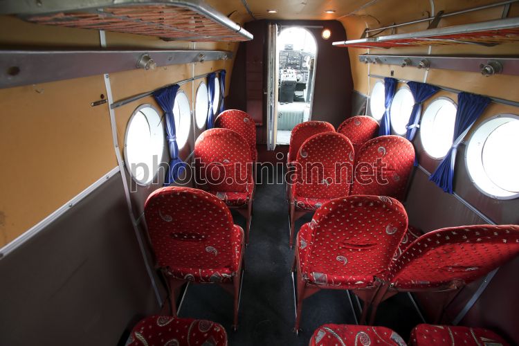 Салон раритетного пасажирського літака Ан-2 в Державному музеї авіації ім. О.К. Антонова, в Києві, 7 жовтня 2025 р. Цього дня у музеї відбулася пресконференція, присвячена передачі державній частині Музейного фонду України єдиного в світі збереженого екземпляра літака Ан-6 та раритетного літака Ан-2П. Фото Синиця Олександр / УНІАН