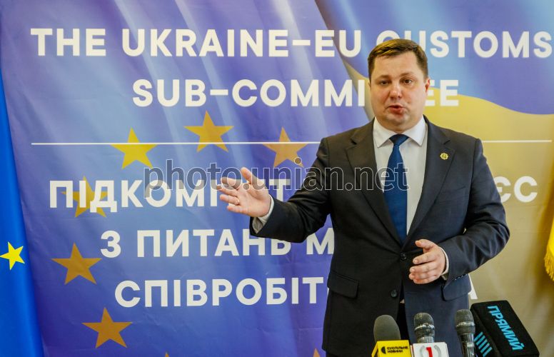 Заступник голови Державної митної служби України Владислав Суворов під час брифінгу за підсумками засідання 9-го Підкомітету Україна–ЄС з питань митного співробітництва, в Ужгороді, 7 жовтня 2025 року. Фото Немеш Янош / УНІАН