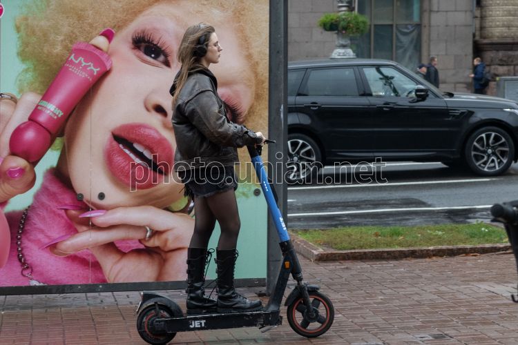 Молода жінка на електросамокаті, в Києві, 9 жовтня 2025 р. Фото УНІАН