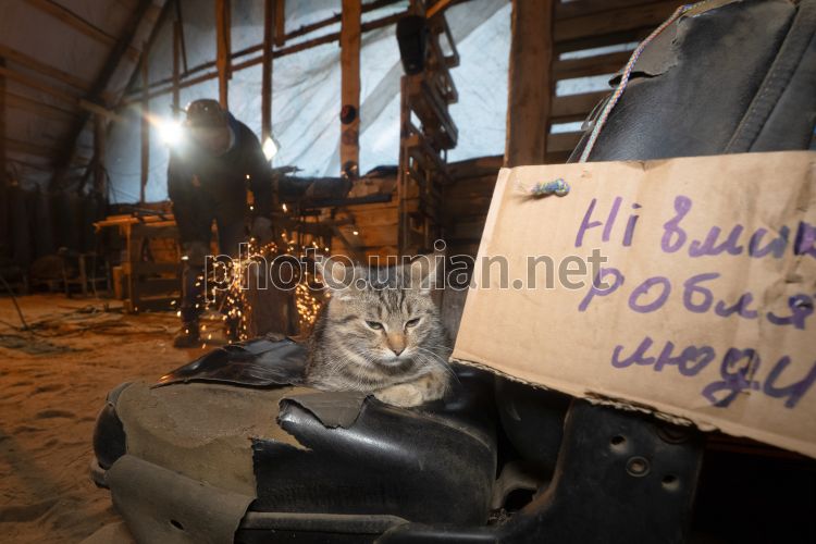 Кіт у майстерні ремонтно-відновлювального батальйону 57 ОМБР в Харкіській області, 20 жовтня 2025 р. Бійці збірного пункту пошкоджених машин ремонтно-відновлювального батальйону 57 ОМБР цими днями працюють над заміною мотора БМП М-113, а також обварюють сіткою ремонтно-евакуаційну машину (на базі танка т-72). Фото Марієнко Андрій / УНІАН