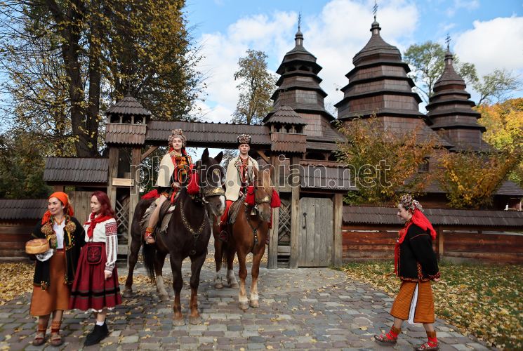 Обрядове дійство “Космацьке весілля” в Музеї народної архітектури та побуту імені Климентія Шептицького (скансен «Шевченківський гай»), 19 жовтня 2025 р. В обрядовому дійстві взяли участь мешканці із гірського села Космач, що на Косівщині. У межах заходу відбулися майстер-класи, презентації та обрядодійства за участі гуцульських традиційних музик і весільної капели і свашок із гірського села Космач. Фото Кравс Євгеній / УНІАН