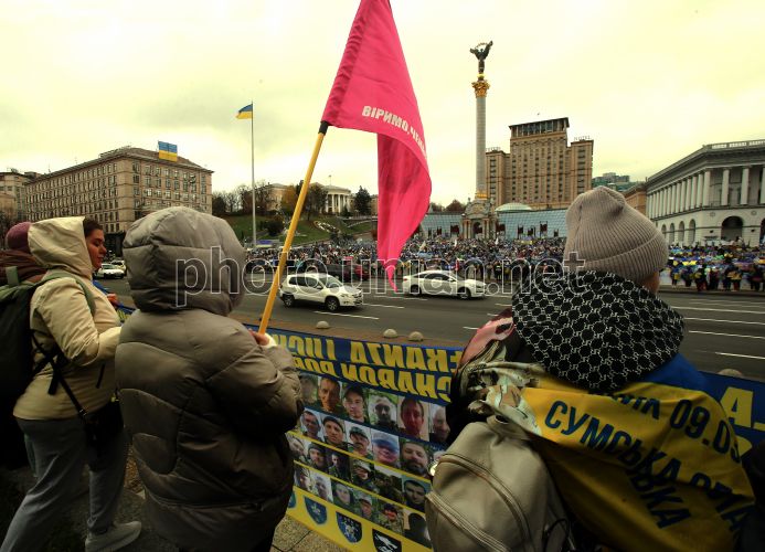 Акція "Об'єднані тишею, що голосніші за слова" на підтримку полонених та зниклих безвісти оборонців, у Києві, 25 жовтня 2025 р. Тисячі людей з різних міст України зібралися на Майдані Незалежності та розгорнули величезний прапор з фото зниклих безвісти. Фото Синиця Олександр / УНІАН