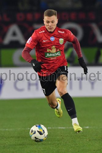 Захисник ФК "Карпати" (Львів) Олексій Сич (№77) під час матчу 6-го туру Чемпіонату України серед команд УПЛ (Прем'єр-ліга) з футболу (сезон 2025/26) між ФК «Полісся» (Житомир) та ФК "Карпати" (Львів) на стадіоні Центральний у Житомирі, 13 грудня 2025 р. Матч закінчився з рахунком 3:2 на користь ФК «Полісся» (Житомир). Фото Тис Микола / УНІАН