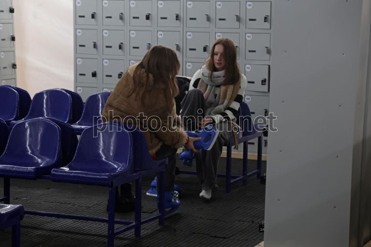 Дівчата одягають ковзани на території ковзанки на Контрактовій площі в Києві, 17 грудня 2025 р. Фото Ковальчук Віктор / УНІАН
