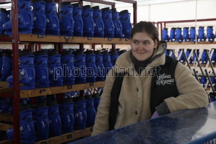 Працівниця видає ковзани напрокат на території ковзанки на Контрактовій площі в Києві, 17 грудня 2025 р. Фото Ковальчук Віктор / УНІАН