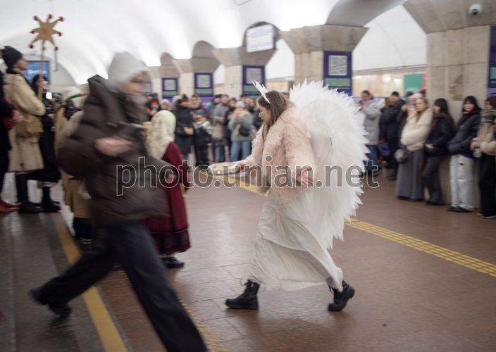 Колядниця у костюмі янгола в київському метро, 27 грудня 2025 р. Фото УНІАН